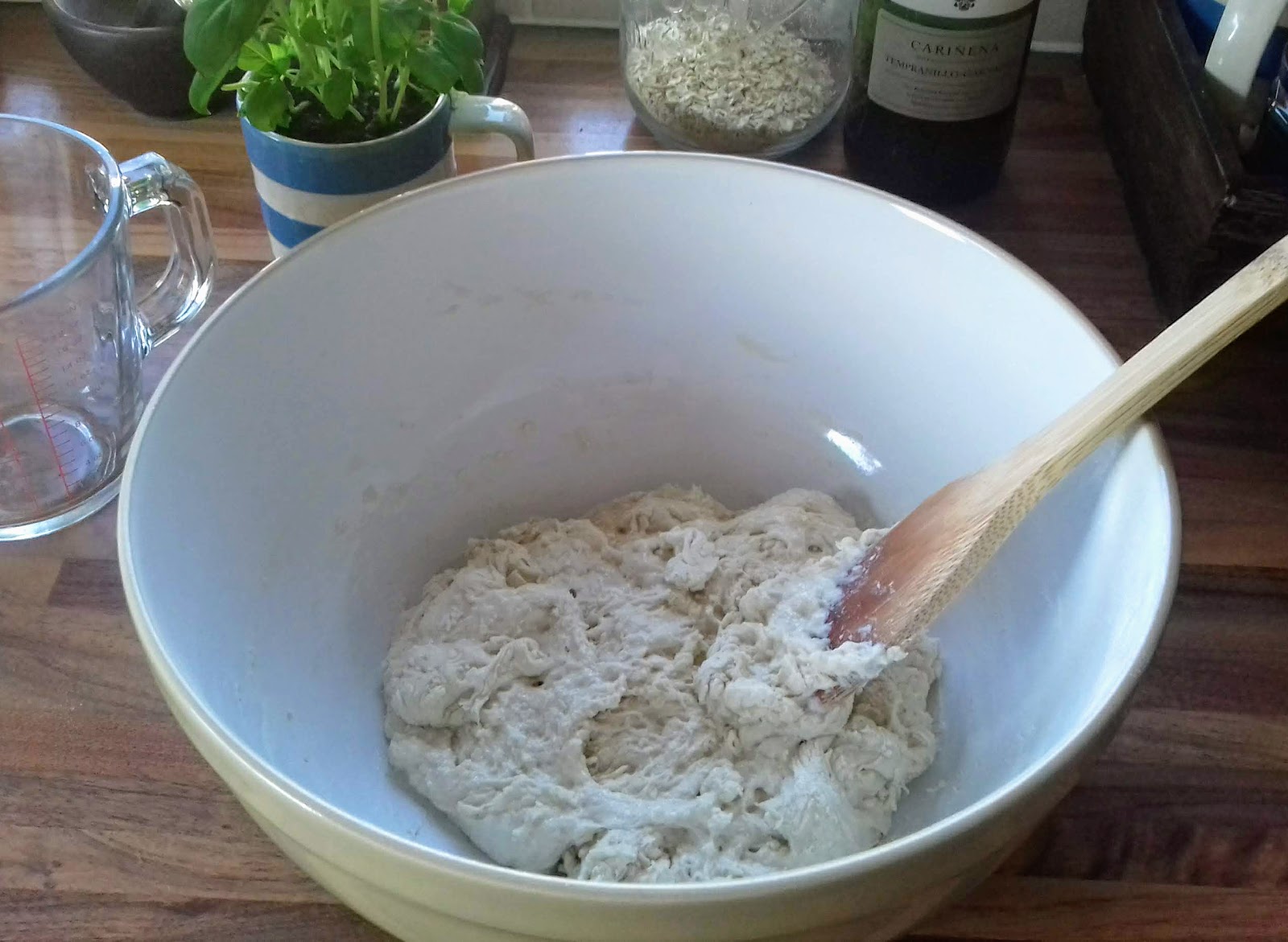 Weigh out the flour and put it into a large mixing bowl, stir in the salt and yeast. Pour in the warm water and mix well together using a wooden spoon to make a sticky dough. Cover with cling film or reusable wrap and leave for at least twelve hours , I leave mine overnight.